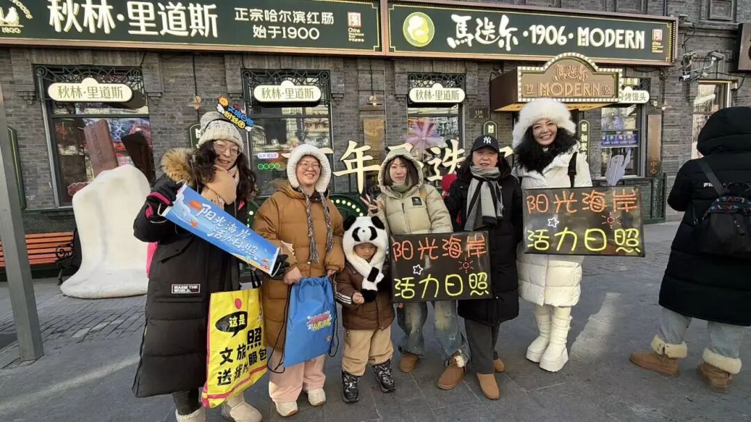 行进式互动环节中,日照推介官们化身“文旅宣传员”,穿梭于巴洛克历史文化保护街区的街巷间,主动与游客招手合影。他们手中的灯塔玩偶、太阳元素宣传牌,成了游客们争相打卡的“网红道具”。来自山西的游客王先生拿着宣传册感慨:“冰城的冰雪很美,日照的阳光大海更让人向往,这趟旅行清单必须加上日照!”江苏的李女士带着孩子把玩着可爱的灯塔玩偶,笑着对推介官说:“本来只想在东北玩雪,现在彻底被日照圈粉了,决定改道去日照,体验一下赶海、看日出的乐趣!”推介团队顺势热情介绍起日照的冬季特色项目——温泉康养、海鲜美食、年俗祈福,全方位展现了日照“山海冬韵”的独特魅力。