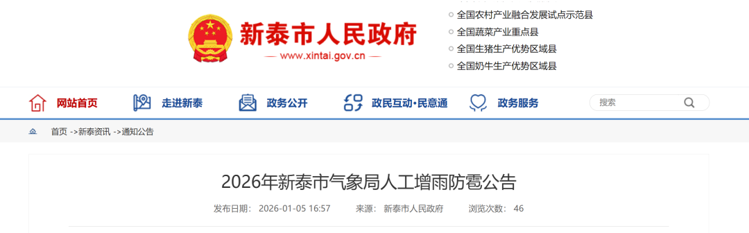 1月5日,新泰市人民政府网站发布2026年新泰市气象局人工增雨防雹公告,具体如下: