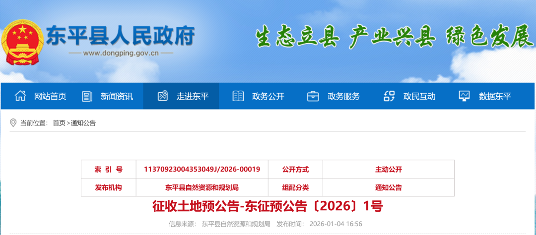 1月4日,东平县人民政府网站发布一则征收土地预公告,具体如下: