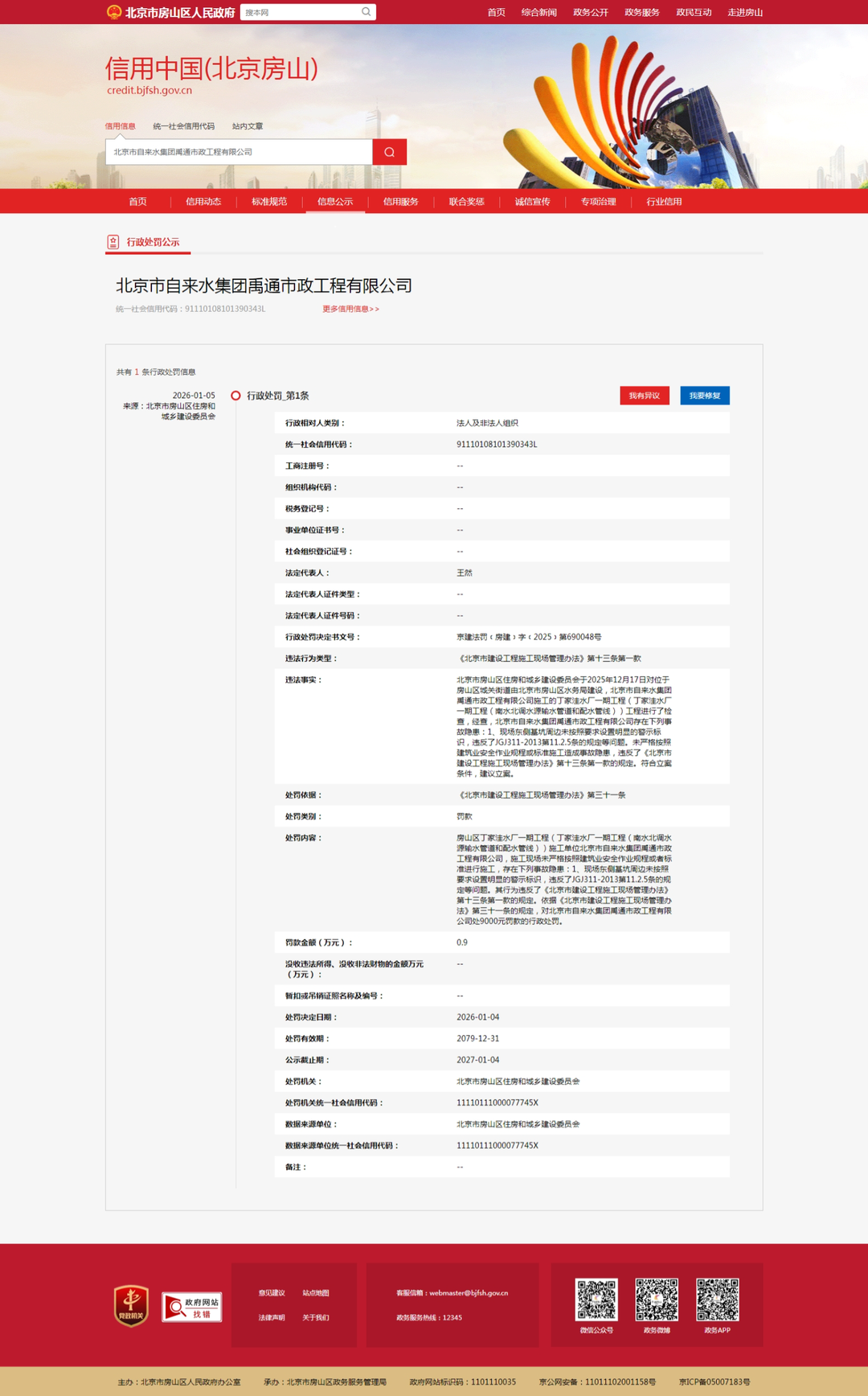 齐鲁晚报·齐鲁壹点记者于信用中国(北京房山)行政处罚栏获悉,北京市自来水集团禹通市政工程有限公司(下称“北京自来水集团禹通市政公司”)收到罚单,该罚单于1月5日公示。