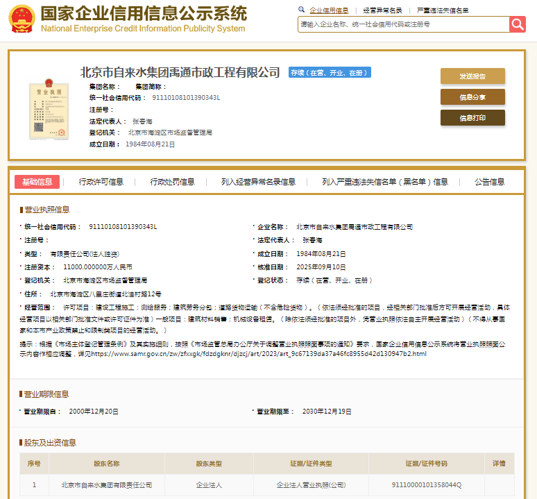 国家企业信用信息公示系统显示,北京市自来水集团禹通市政工程有限公司成立于1984年,注册资本11000万元人民币,法定代表人张春海,由北京市自来水集团有限责任公司全资持股。