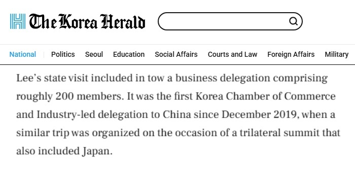 《韩国先驱报》的报道指出,李在明总统此次访华携规模约200人的商务代表团随行。这也是大韩商工会议所(韩国最大民间经济团体)自2019年12月中日韩领导人会议期间组织类似代表团后,时隔近四年首次率团访华。