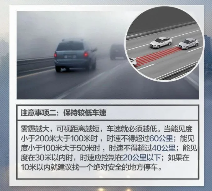 6.低速行驶。雾霾天气开车一定要控制车速保持低速,由于能见度低看不清前面的行人和车辆,低速行驶可以有助于让车子在遇到突发状况的时候,立即制动停车。