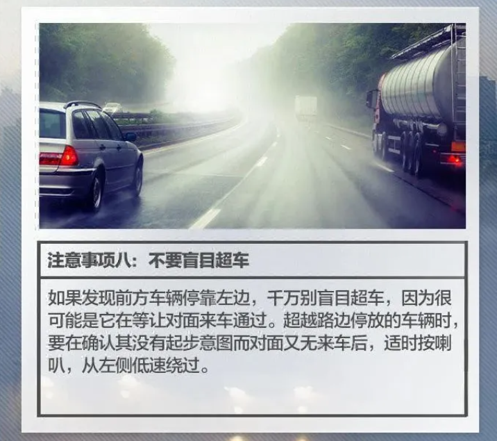 11.谨慎超车。雾霾天气由于能见度低,车辆都会低速行驶,这时一定不要心急,看到前面的车子太慢就准备超车。超车的时候,要先鸣笛示意,如果听到前方也有鸣笛声或者是前面有微弱灯光的时候,一定不要继续超车,谨慎超车避免发生交通事故。