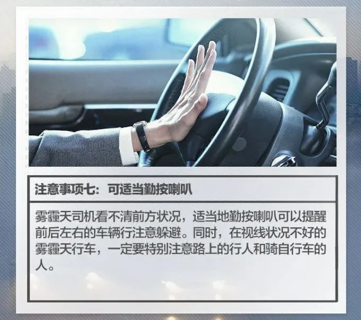 12.勤鸣笛。在雾霾天气开车时,要经常按喇叭示警车辆和行人,特别是在经过交通路口的时候,鸣笛可以提示转弯或直行的车辆和行人进行躲让,防止交通事故的发生。