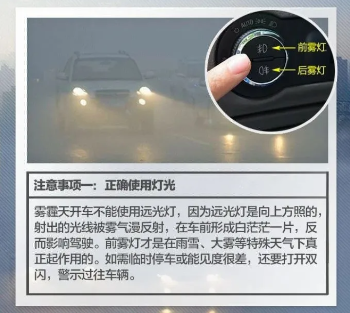 7.灯光的使用。雾霾天气开车还要注意灯光的使用,记住一定要打开前后雾灯以及应急灯,如果没有雾灯的车辆,要打开近光灯,千万不要打开远光灯,远光灯会被迷雾反射看不清道路的。