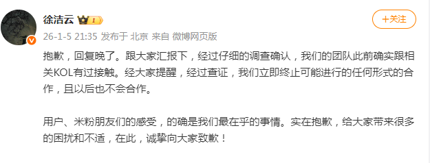小米徐洁云致歉:团队跟相关KOL确实有过接触,立即终止