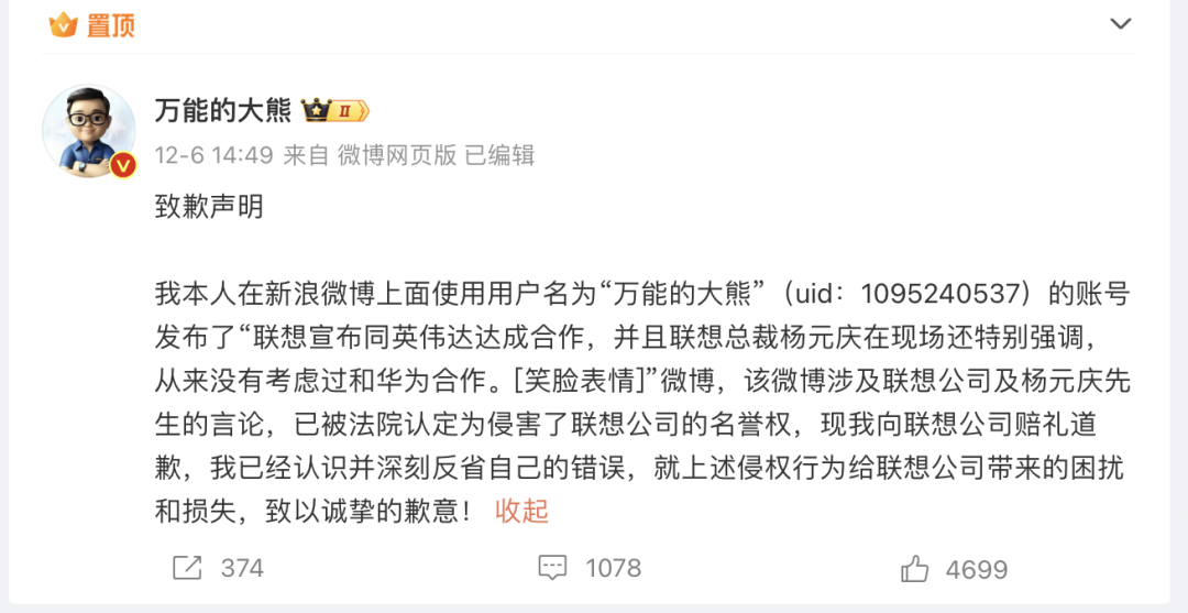2024年,“万能的大熊”因编造联想与华为对立的谣言,被判向联想集团道歉并支付经济损失及相关费用共计16万余元。