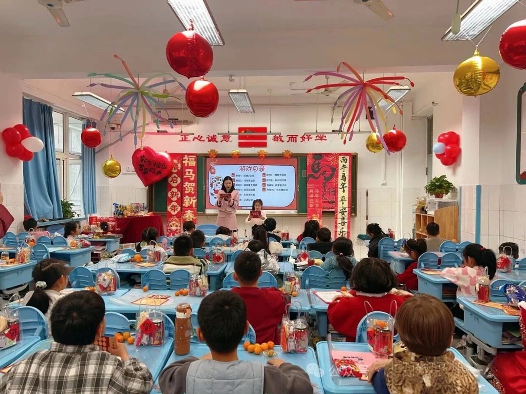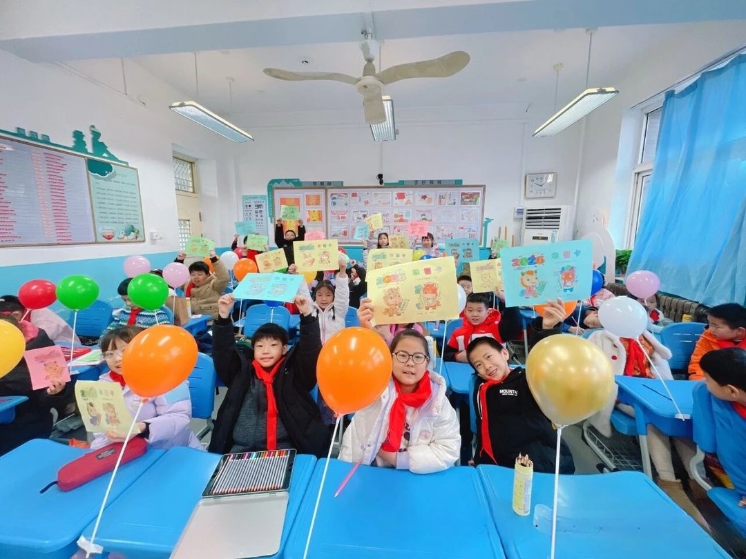 各班教室化身欢乐小天地,唱歌、跳舞、相声、小品轮番上演,猜谜语、方言读诗等趣味互动与美食分享环节交织,师生同乐、温馨融融。同学们用心绘制色彩斑斓的幸福卡,把对新年的美好期许细细勾勒。