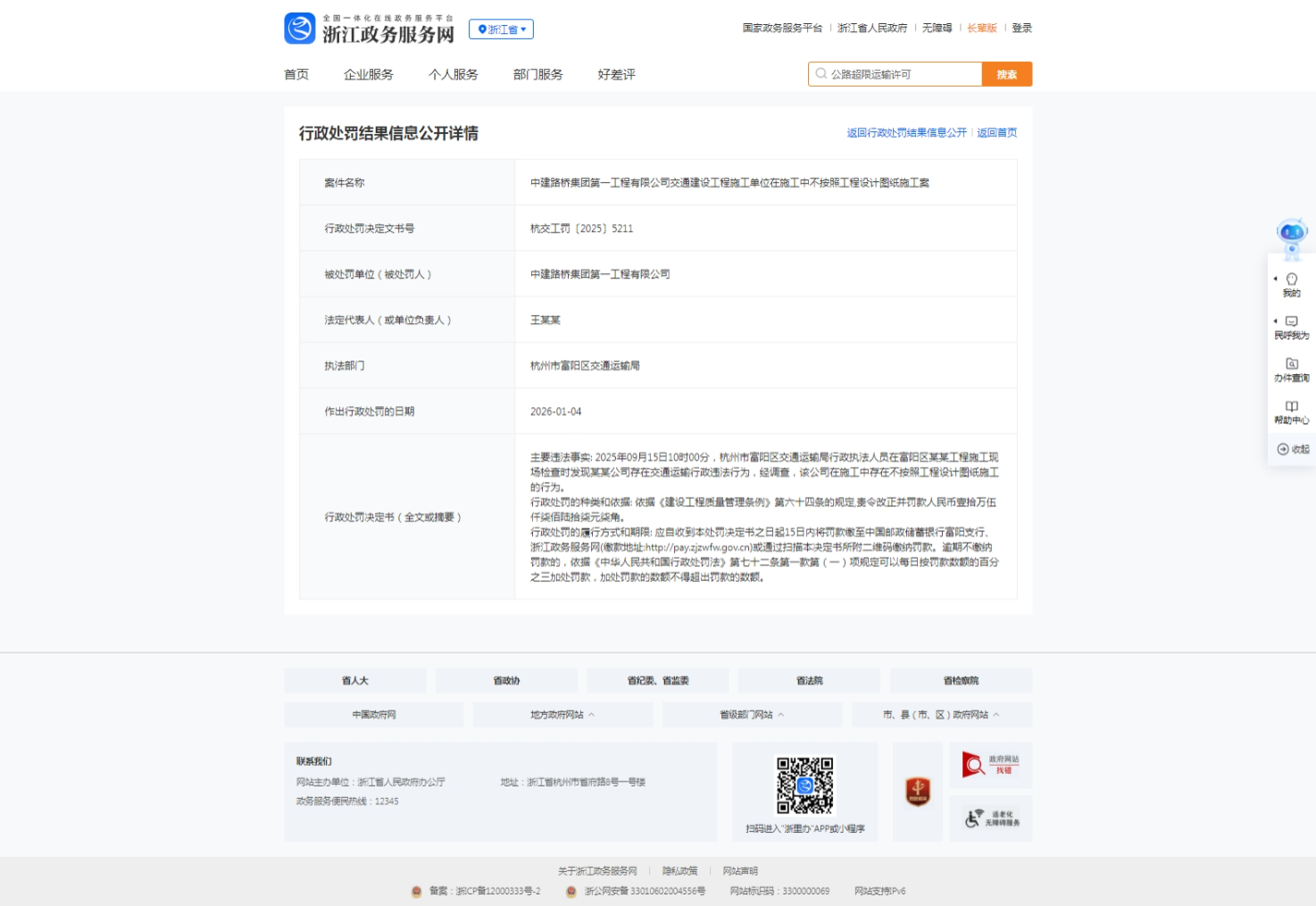 齐鲁晚报·齐鲁壹点记者于浙江政务服务网行政处罚栏获悉,1月4日,中建路桥集团第一工程有限公司(下称“中建路桥一公司”)收杭州市富阳区交通运输局罚单,处罚决定书文号:杭交工罚(2025)5211。