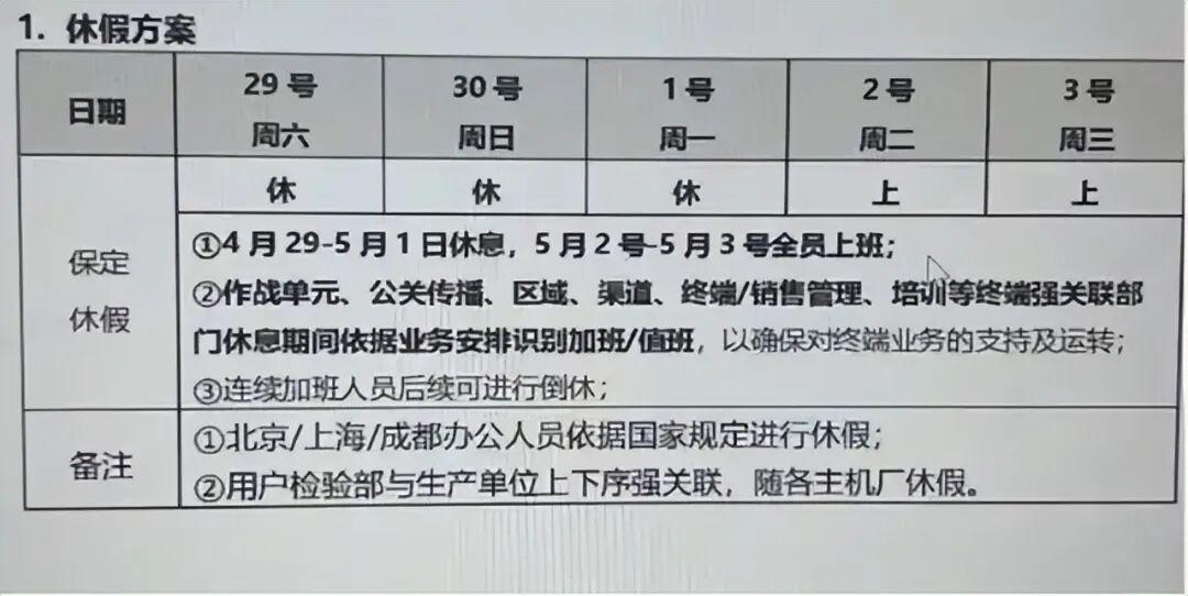 2023年的“五一加班事件”至今让不少长城员工记忆犹新。当年上海车展被视为企业翻身仗,为承接流量,公司要求作战单元、公关、区域等部门员工5月2日、3日正常上班,仅北上广成三地可正常休息。这意味着,员工通过2天周末+2天调休换来的5天假期,实际仅1天额外休息,加班后反而比平时多上1天班。