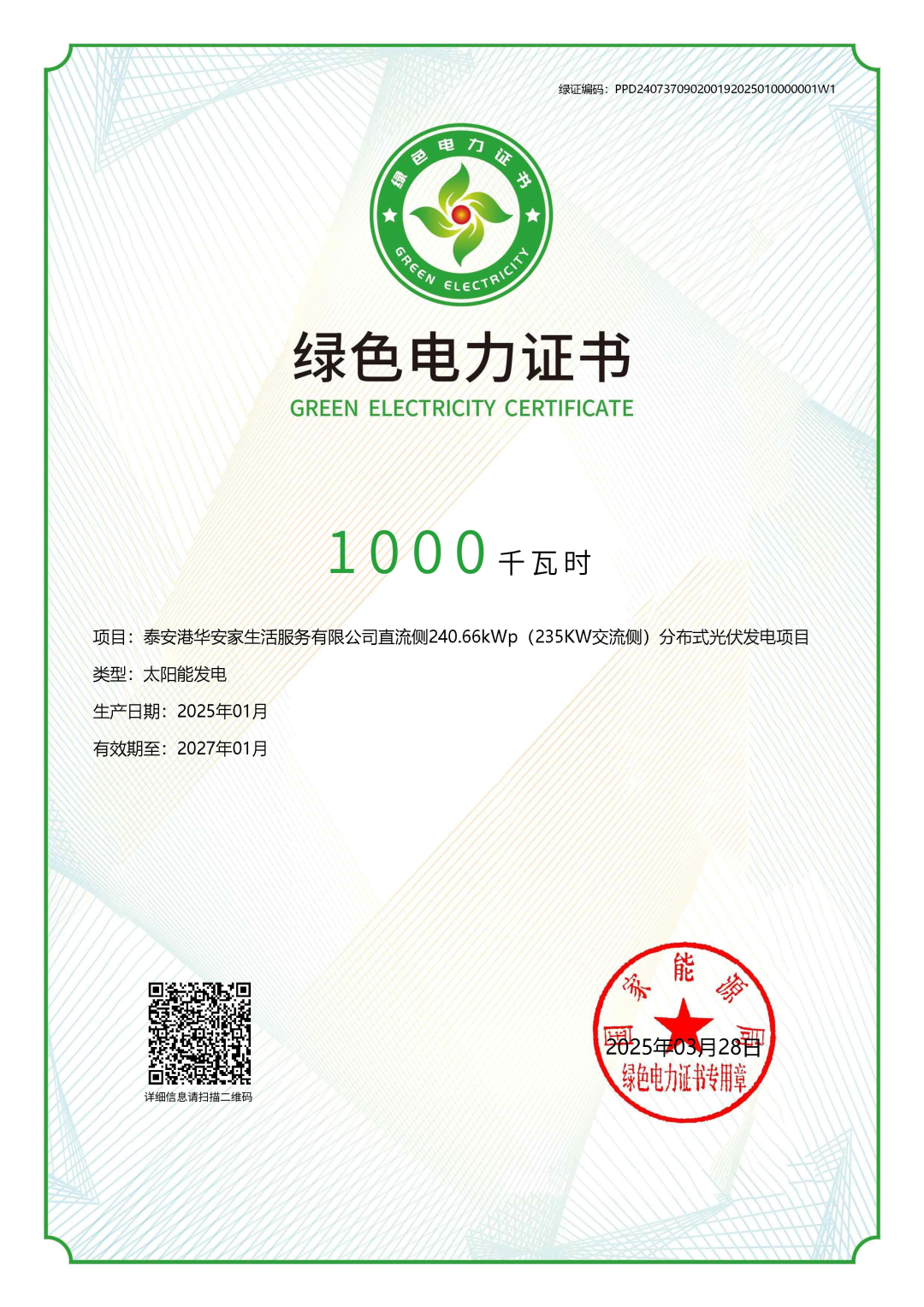 回溯至2024年,泰山港华“直流侧240.66kWp(235KW交流侧)分布式光伏发电项目”成功获得了由国家能源局核发的绿色电力证书,这张泰安市首张分布式光伏发电项目“绿证”,不仅是对该项目绿色属性的权威认证,更标志着泰山港华在绿色能源转型和可持续发展领域迈出了坚实且关键的一步。作为国有控股企业,泰山港华燃气始终将绿色发展理念深植企业发展战略,主动肩负起推动能源结构优化、践行生态环保责任的使命担当,该光伏项目的落地与绿证的获取,正是企业践行社会责任的生动实践。