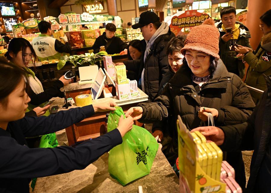 지난해 12월 31일 칭다오 맥주 박물관 문화창의 구역에서 칭다오 맥주를 구매하는 한국 관광객. (사진/신화통신)