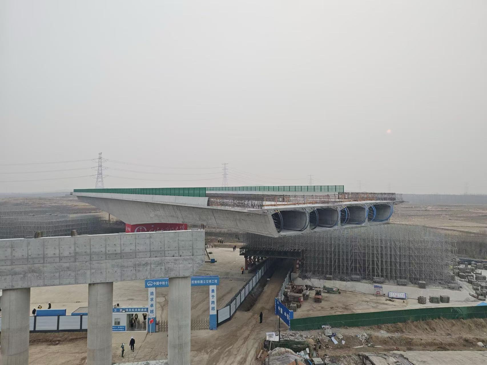 作为鲁南地区交通路网的重要节点工程,该转体桥以复杂设计与高难度施工工艺,成为全线焦点。据介绍,董梁高速(沈海高速至新泰段)全长197.108公里,采用双向四车道高速公路标准建设,设计时速120公里,桥梁涉铁工程总长190米,桥面宽度30.8米,采用2×82米预应力混凝土T型刚构+26米简支箱梁组合结构,主桥创新采用斜腹板式单箱四室三向预应力变截面箱梁设计。