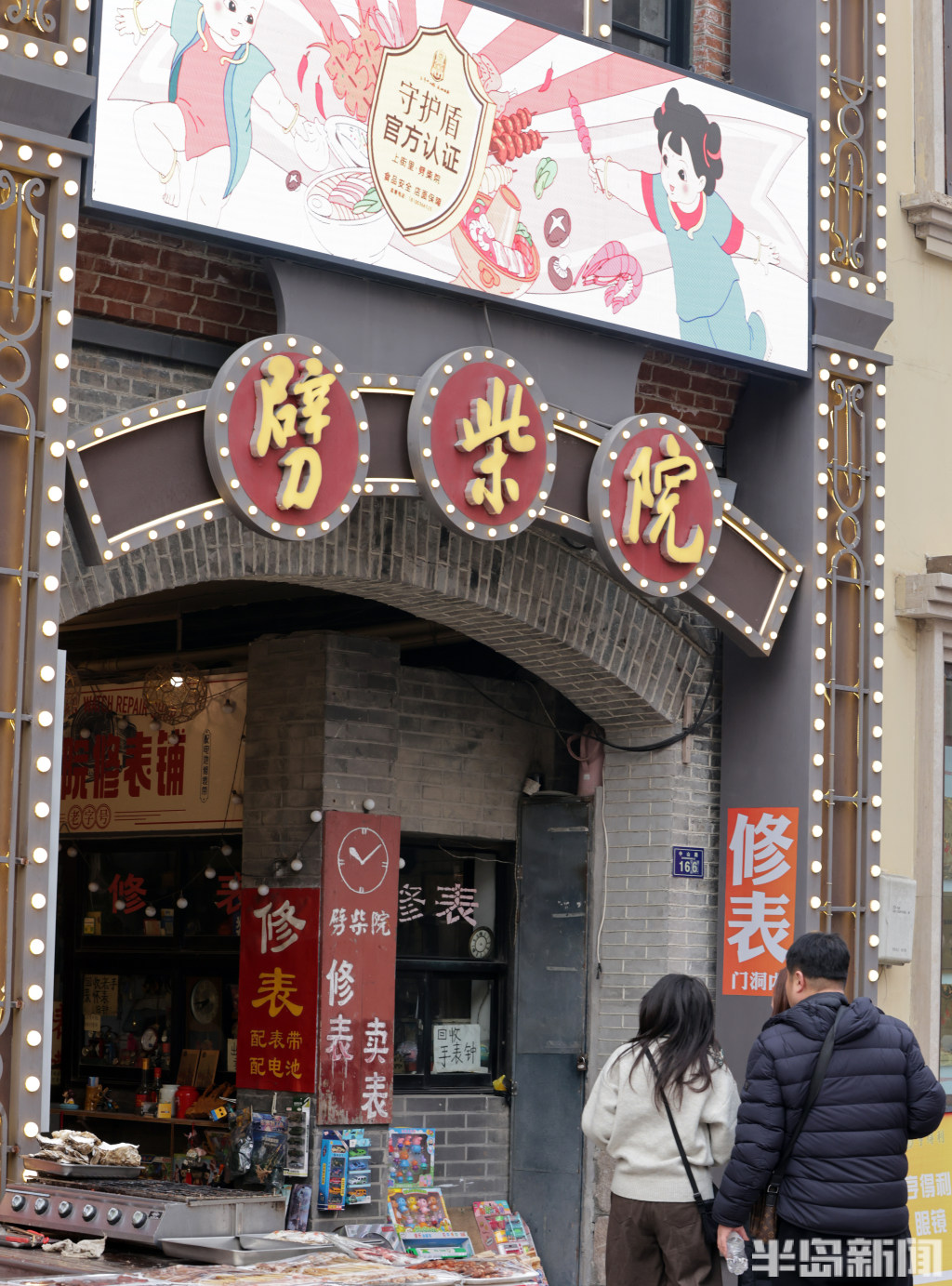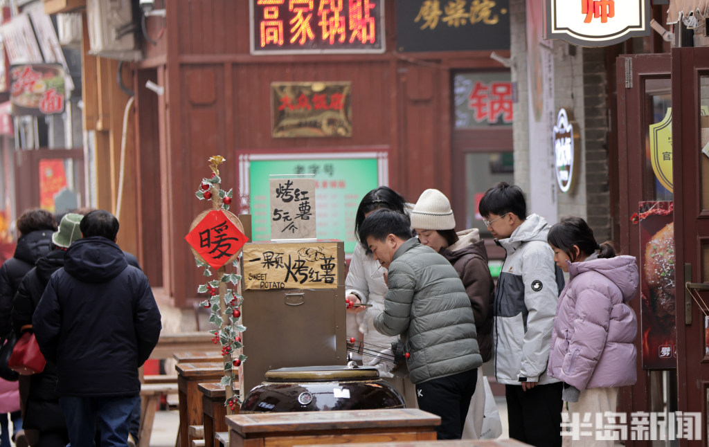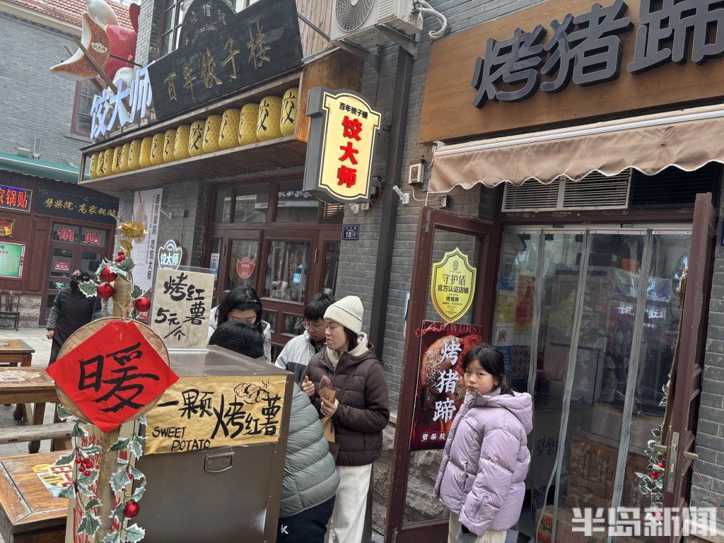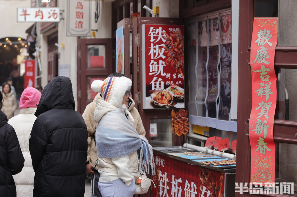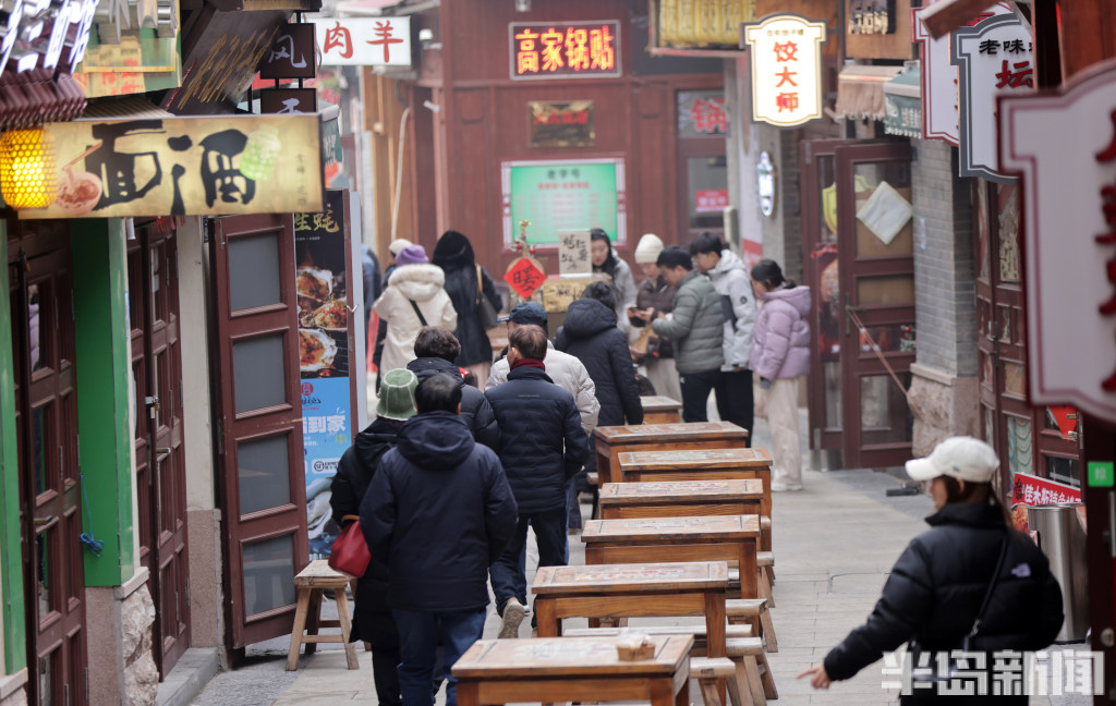 1月6日,寒意袭人的岛城街头,百年老街青岛劈柴院却洋溢着热闹的烟火气。来自各地的游客齐聚于此,其中不乏慕名而来的韩国游客,他们穿梭在古色古香的院落间,一边品尝特色小吃,一边感受老街独有的风土人情。
