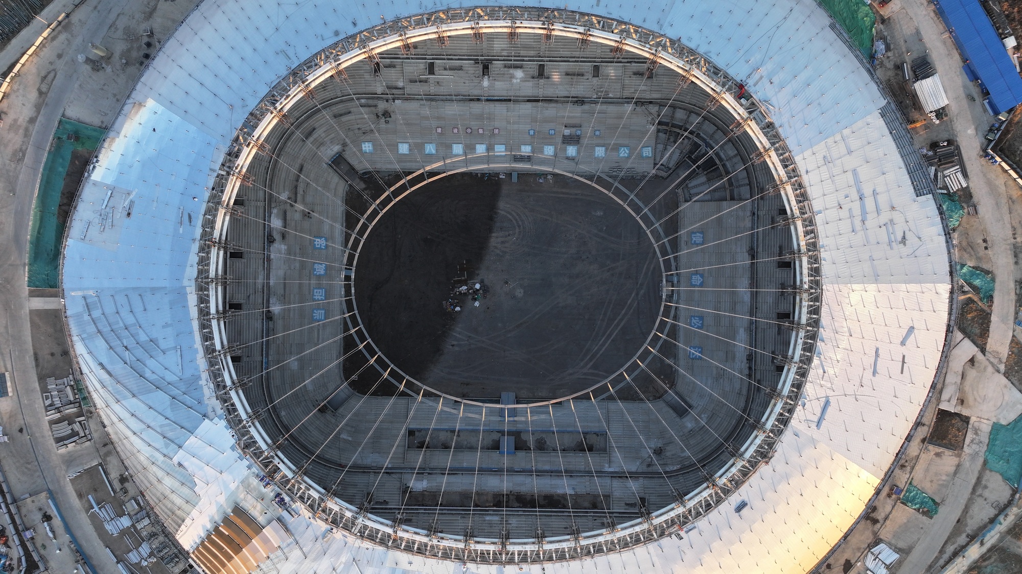 据项目负责人介绍,该足球场按世俱杯标准设计,可满足国际顶级赛事需求。索网体系形似“巨型自行车轮”,上方将铺设高透光PTFE膜,为草坪提供充足自然光,预计年省电费数百万元。