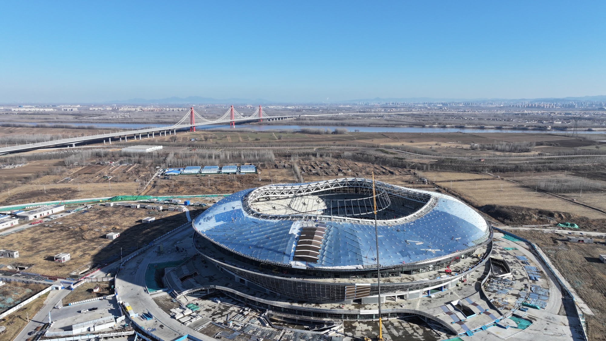 1月5日,山东济南黄河体育中心专业足球场实现关键进展——屋盖核心结构“轮辐式索桁架”完成整体提升,标志着项目正式进入屋盖膜结构施工阶段。