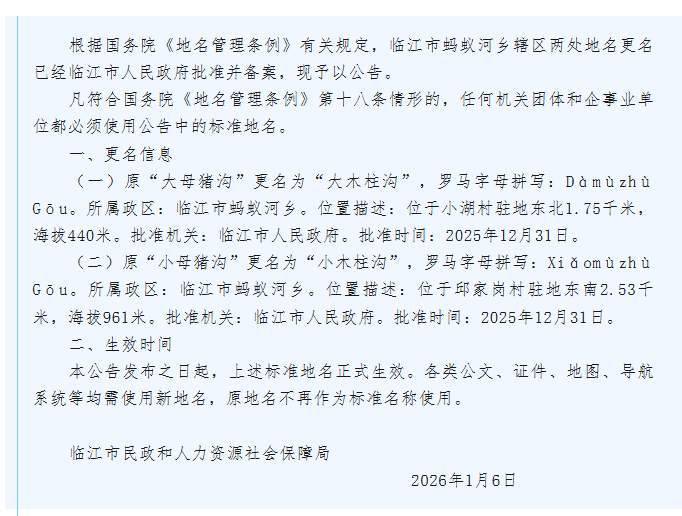 公告显示,原“大母猪沟”更名为“大木柱沟”,罗马字母拼写:Dàmùzhù Gōu。所属政区:临江市蚂蚁河乡。位置描述:位于小湖村驻地东北1.75千米,海拔440米。批准机关为临江市人民政府。批准时间为2025年12月31日。