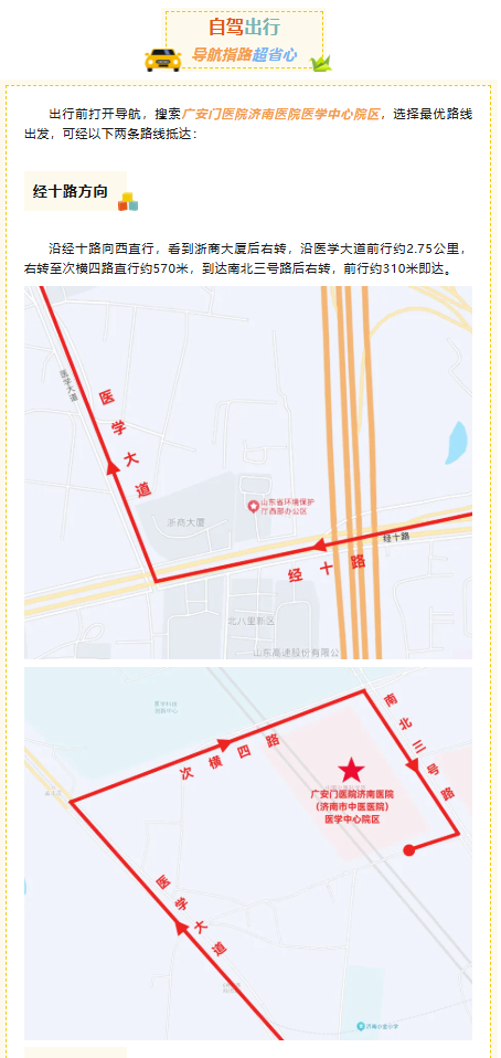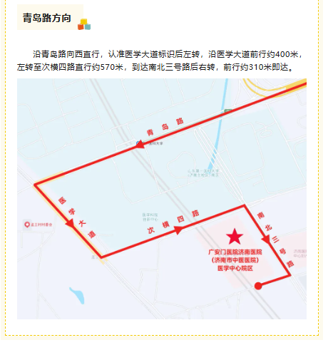 准备前往广安门医院济南医院医学中心院区就医?不知道选哪种出行方式最方便?别担心!这份公共交通、自驾超全攻略,一次性帮您理清,让您轻松到院不迷路!(来源:济南卫生健康)