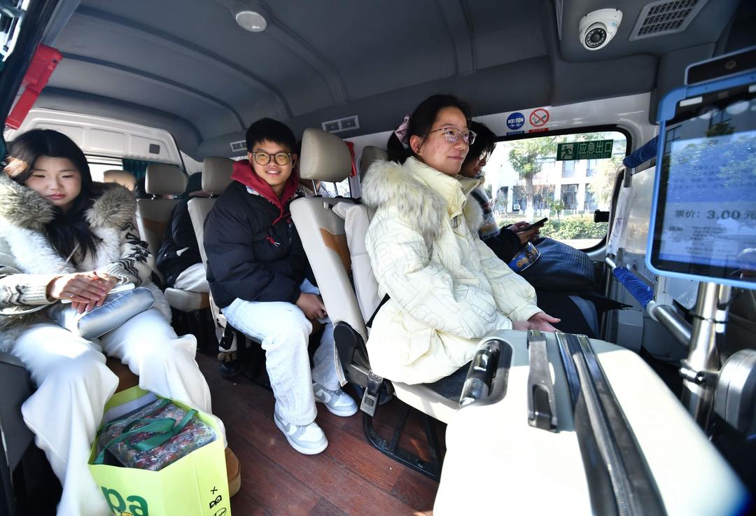 2025年12月26日,位于长江新区的武汉文理学院学生在校内乘坐定制微公交3路,准备前往梅教街地铁高车站。这条定制微公交线路开通前,学生们需打车或拼车前往地铁站。长江日报记者詹松 摄