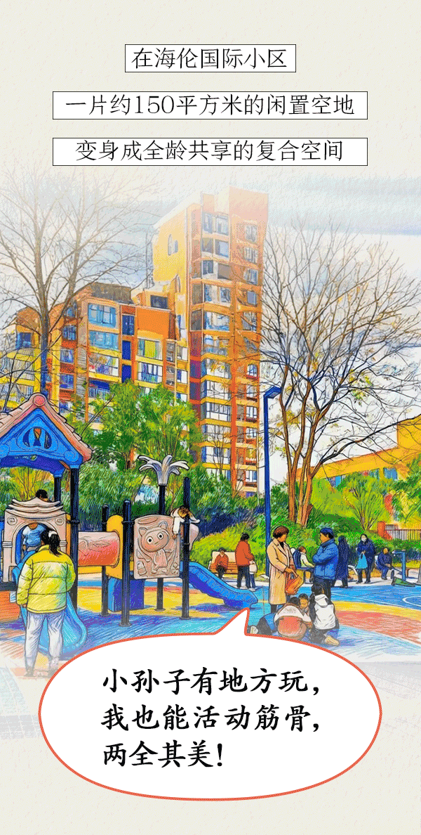 解决好“一老一小”,城市才更有吸引力。在海伦国际小区,一片约150平方米的闲置空地,通过社区露天议事、网格员上门问需、街道与开发商协同,变身为全龄共享的复合空间:孩子们嬉戏,老人们健身,年轻人休憩。“小孙子有地方玩,我也能活动筋骨,两全其美。”居民老王感慨地说。