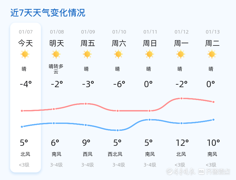 今天是1月7日,星期三,农历十一月十九。泰安市今日天气晴朗,气温范围在-4℃至5℃之间,西北风1级,空气湿度81%,PM2.5指数为100。各区均为晴朗天气。市民出行时建议做好保暖措施,注意防风保暖。