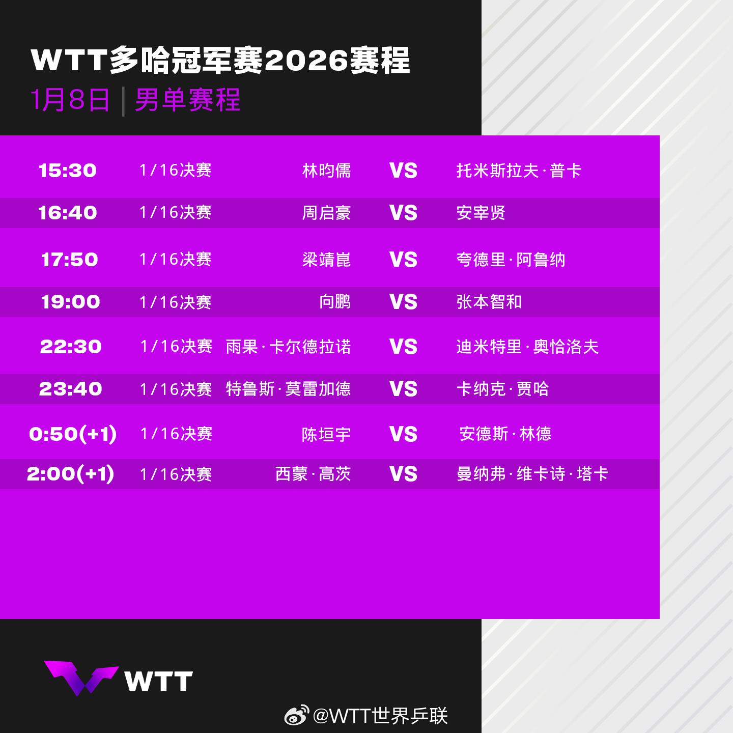 2026年WTT多哈冠军赛将于1月7日至11日在卡塔尔多哈卢赛尔体育馆举行男女单打各32名选手展开争夺首轮比赛对阵赛程请查收↓