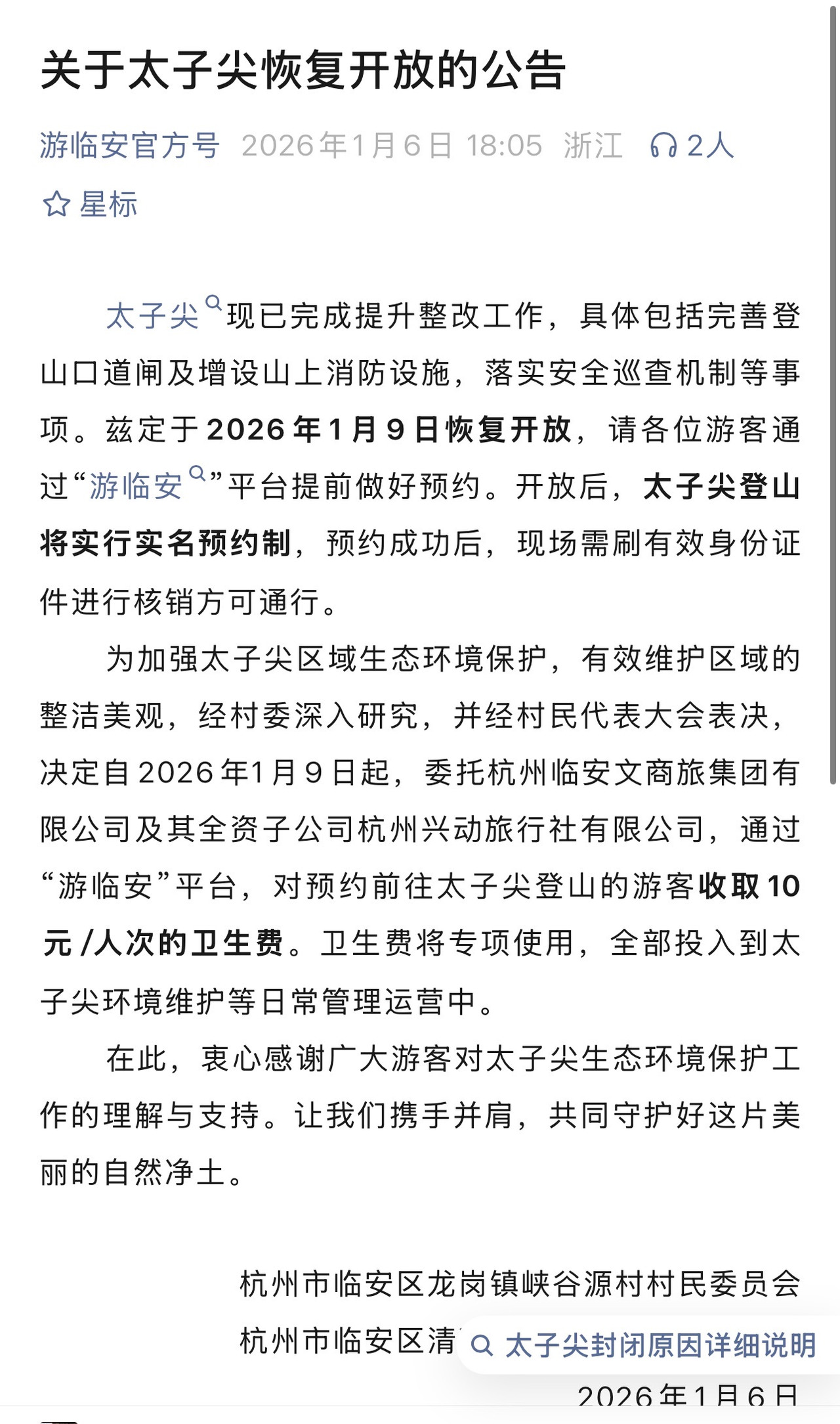 为加强太子尖区域生态环境保护,有效维护区域的整洁美观,经村委深入研究,并经村民代表大会表决,决定自2026年1月9日起,委托杭州临安文商旅集团有限公司及其全资子公司杭州兴动旅行社有限公司,通过“游临安”平台,对预约前往太子尖登山的游客收取10元/人次的卫生费。卫生费将专项使用,全部投入到太子尖环境维护等日常管理运营中。