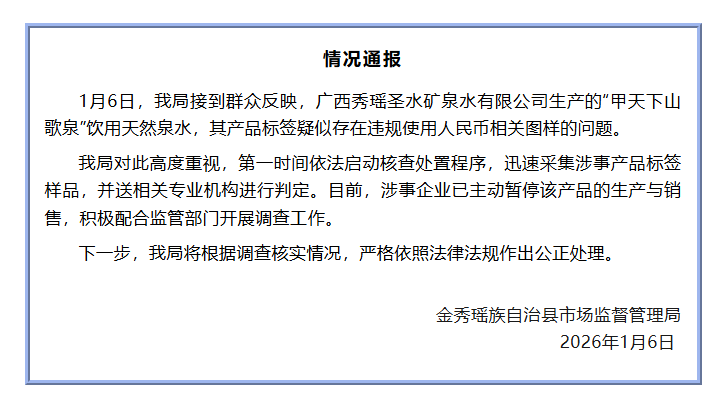 广西金秀瑶族自治县市场监督管理局1月6日通报:1月6日,接到群众反映,广西秀瑶圣水矿泉水有限公司生产的“甲天下山歌泉”饮用天然泉水,其产品标签疑似存在违规使用人民币相关图样的问题。