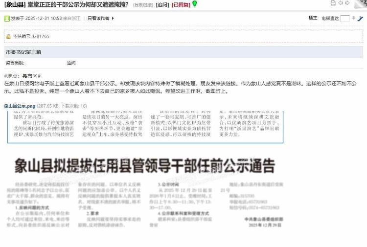 近日,网友反映,浙江象山县组织部在当地报纸发布的一则干部任前公示存在问题,相比于版面其他内容,电子版公示内容做了模糊处理,质疑这样的公示“遮遮掩掩”,希望改进。当地仅回复了一句“任前公示情况通过电视台及报纸向社会通报”,并未解释原因。详情>>