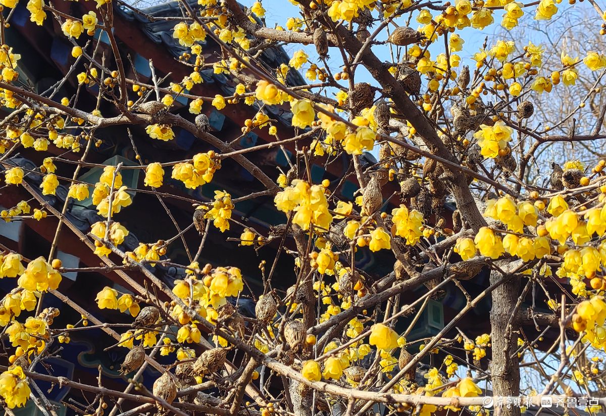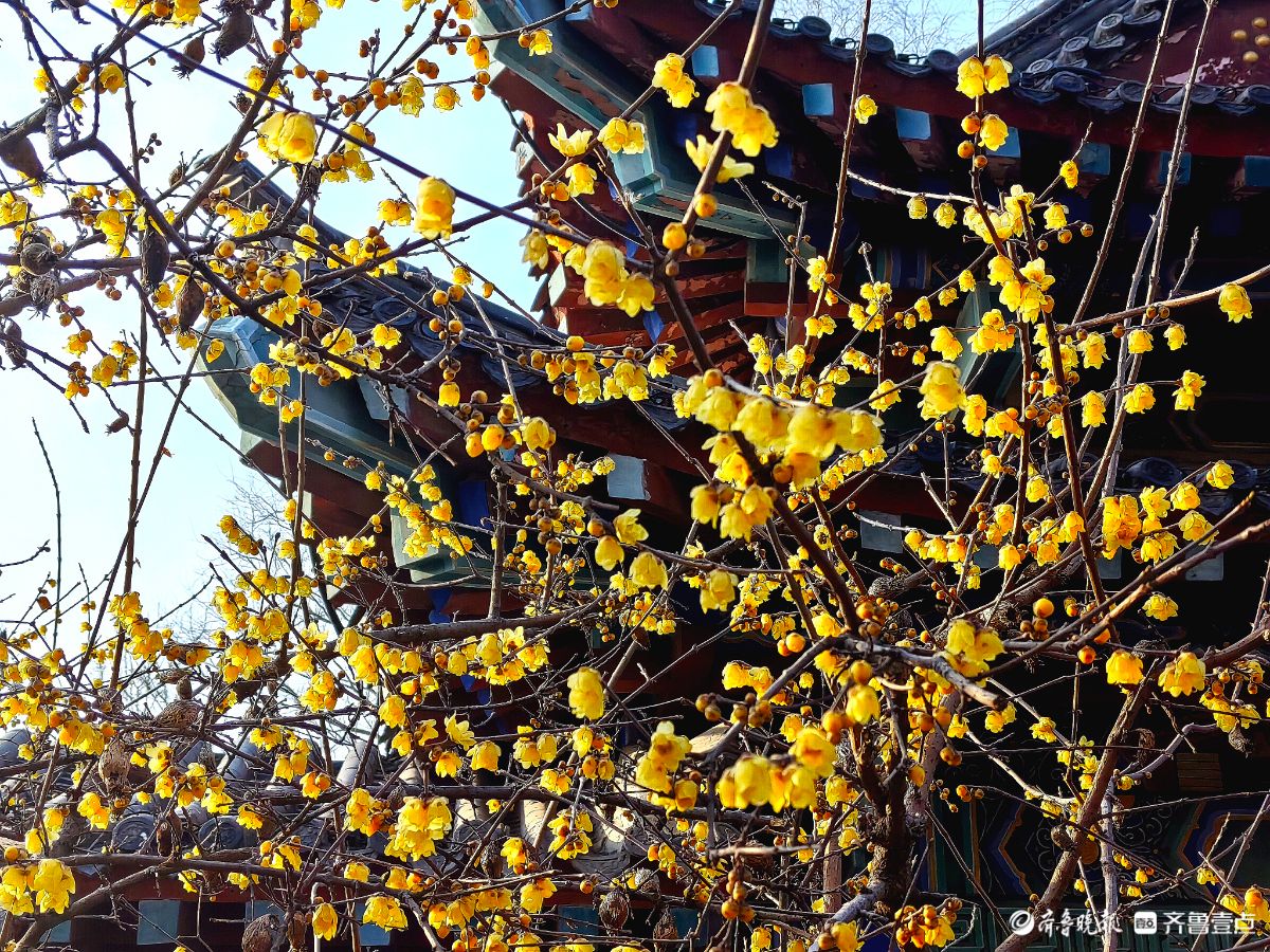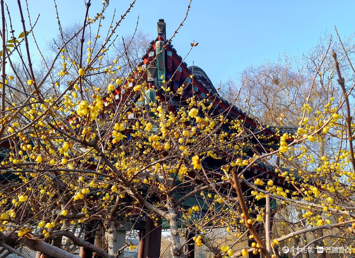 冬日的济南大明湖小东湖东侧,腊梅迎来了盛放期。古色古香的亭台飞檐旁,满枝金黄的腊梅迎着寒风绽露芳华,嫩黄的花瓣簇拥在遒劲的枝丫间,在澄澈蓝天的映衬下,像缀了满树的碎金。游人纷纷驻足,举着手机定格这份冬日美好。镜头里,腊梅的娇黄与古建筑的黛瓦红柱相映成趣,暗香浮动间,为料峭的冬日济南添了一抹鲜活的亮色,也让大明湖的冬景多了几分雅致与温柔。王平摄