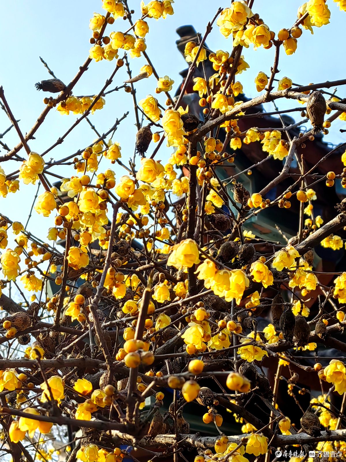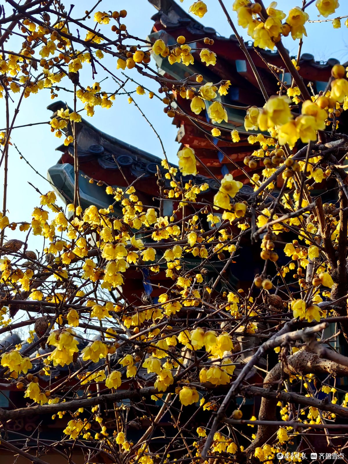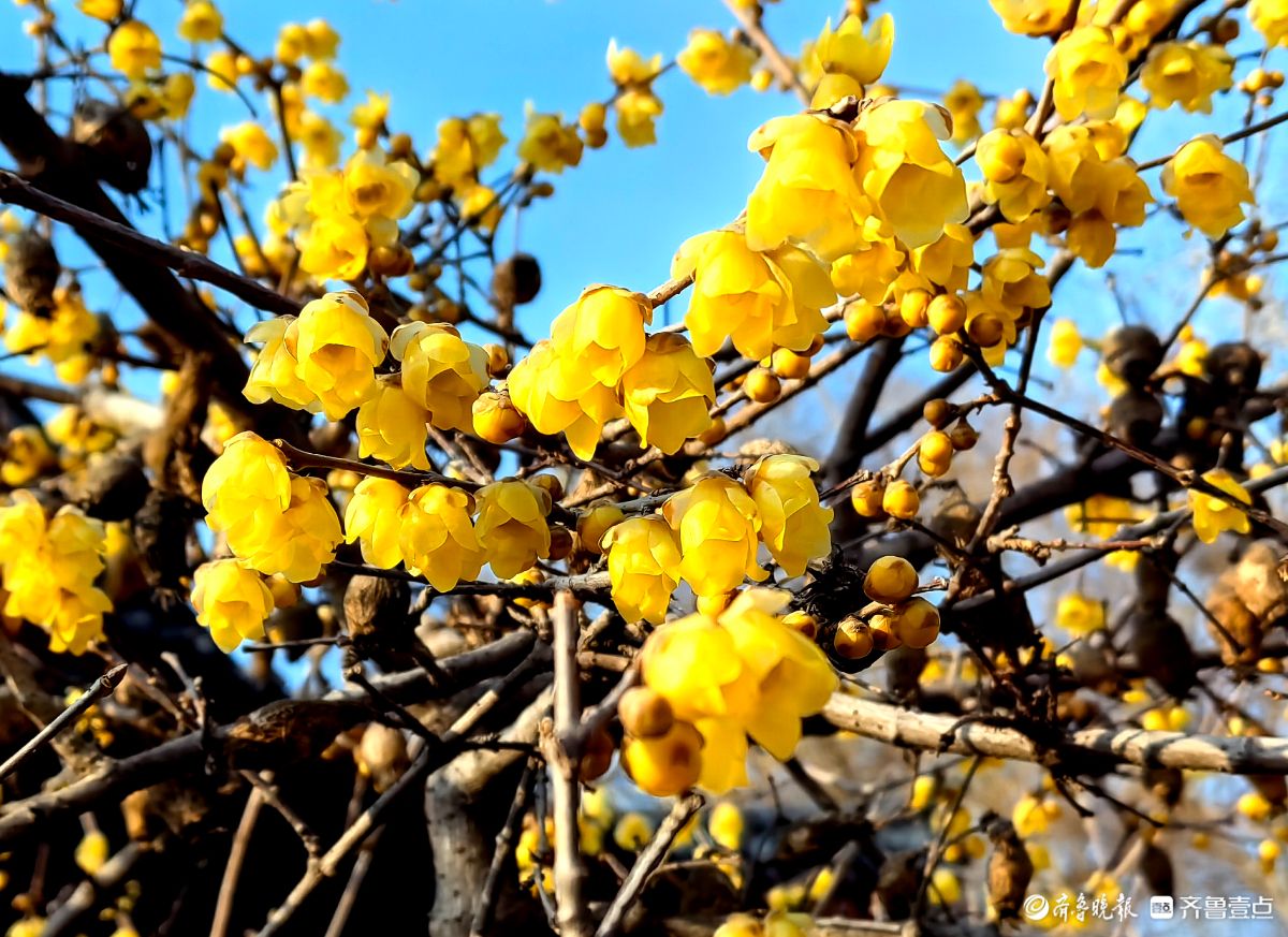 冬日的济南大明湖小东湖东侧,腊梅迎来了盛放期。古色古香的亭台飞檐旁,满枝金黄的腊梅迎着寒风绽露芳华,嫩黄的花瓣簇拥在遒劲的枝丫间,在澄澈蓝天的映衬下,像缀了满树的碎金。游人纷纷驻足,举着手机定格这份冬日美好。镜头里,腊梅的娇黄与古建筑的黛瓦红柱相映成趣,暗香浮动间,为料峭的冬日济南添了一抹鲜活的亮色,也让大明湖的冬景多了几分雅致与温柔。王平摄