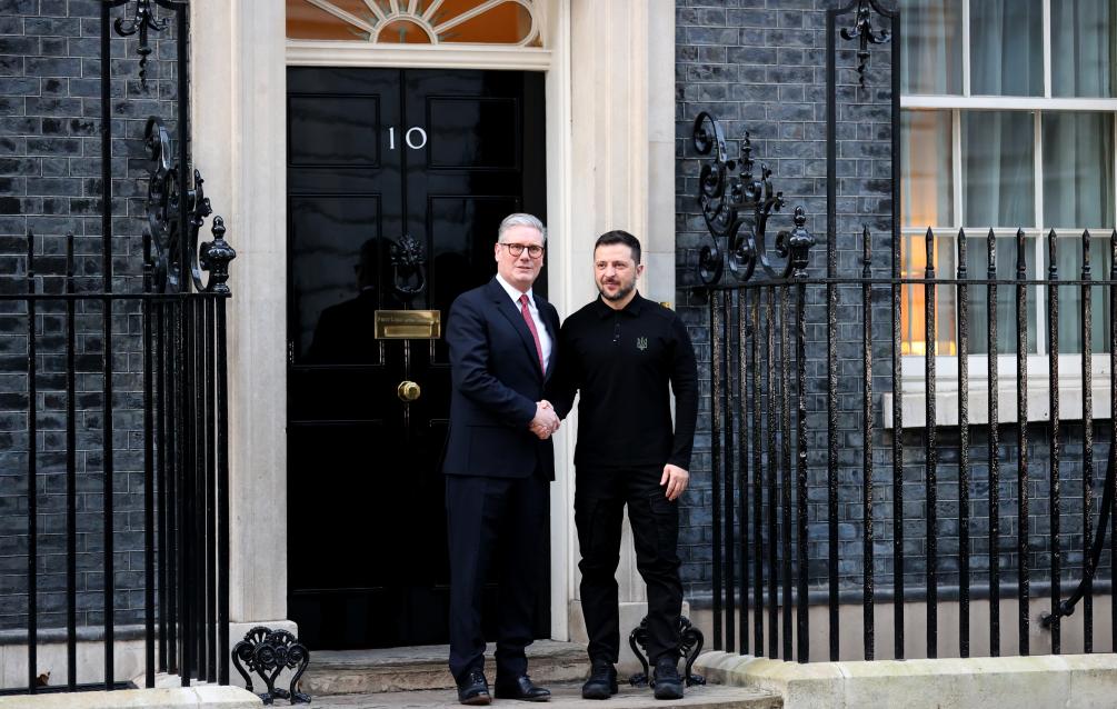 2025年3月1日,在英国伦敦唐宁街10号首相府前,英国首相斯塔默(左)与乌克兰总统泽连斯基握手。