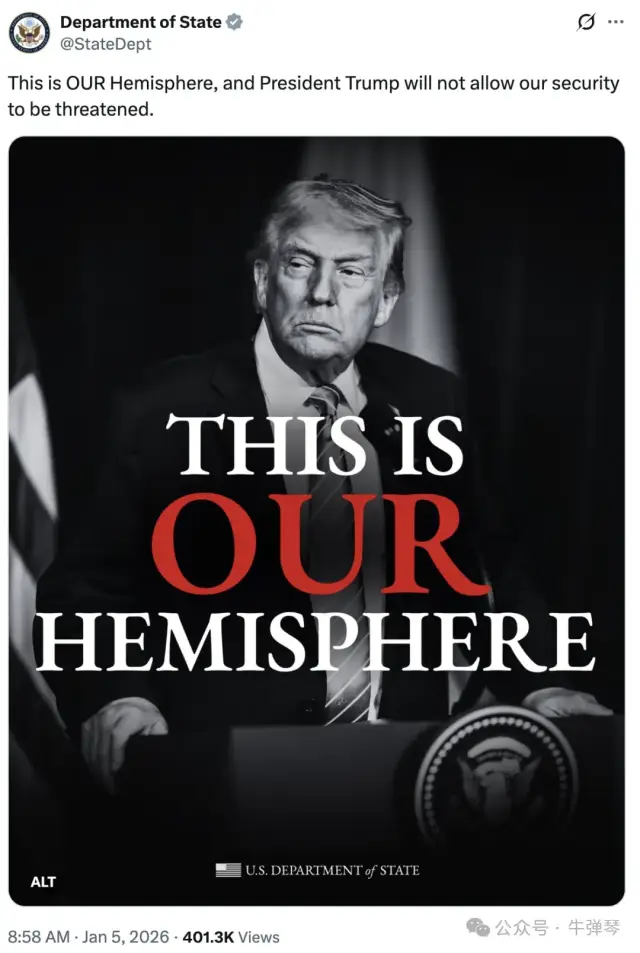 美国虎视眈眈,“唐罗主义”大行其道。美国务院更贴文表示:这是我们的半球!