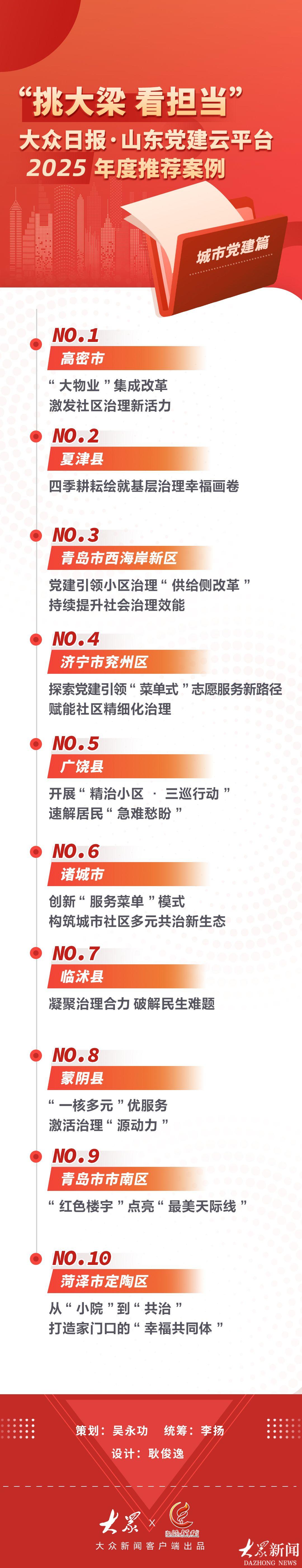 岁末年初,大众日报·山东党建云平台优中选优,盘点推出2025年度推荐案例,涵盖农村党建、城市党建、机关党建、企业(“两新”)党建四大类别,以此激励引导全省各级党组织抓党建强党建,以高质量党建引领高质量发展。本期展示的是“挑大梁 看担当”大众日报·山东党建云平台2025年推荐案例(城市党建篇)。