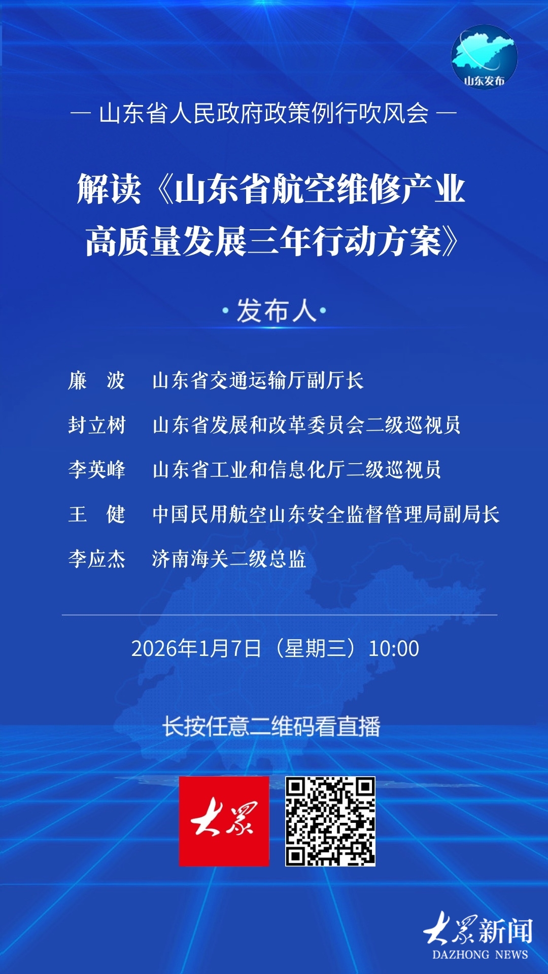 事关航空维修产业发展!今天上午10时山东省政府将举行例行吹风会山东发布 | 2026-01-07 09:36:16 原创崔晗 申家鑫来源:大众新闻微信扫码扫码下载客户端省政府新闻办定于1月7日(周三)上午10:00举行省政府政策例行吹风会,邀请省交通运输厅负责同志等解读《山东省航空维修产业高质量发展三年行动方案》。(大众新闻记者 崔晗 申佳鑫)责任编辑:韩雨婷