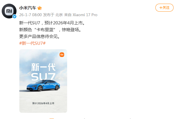 1月7日,小米汽车发文:新一代SU7,预计2026年4月上市。新颜色“卡布里蓝”,惊艳登场。