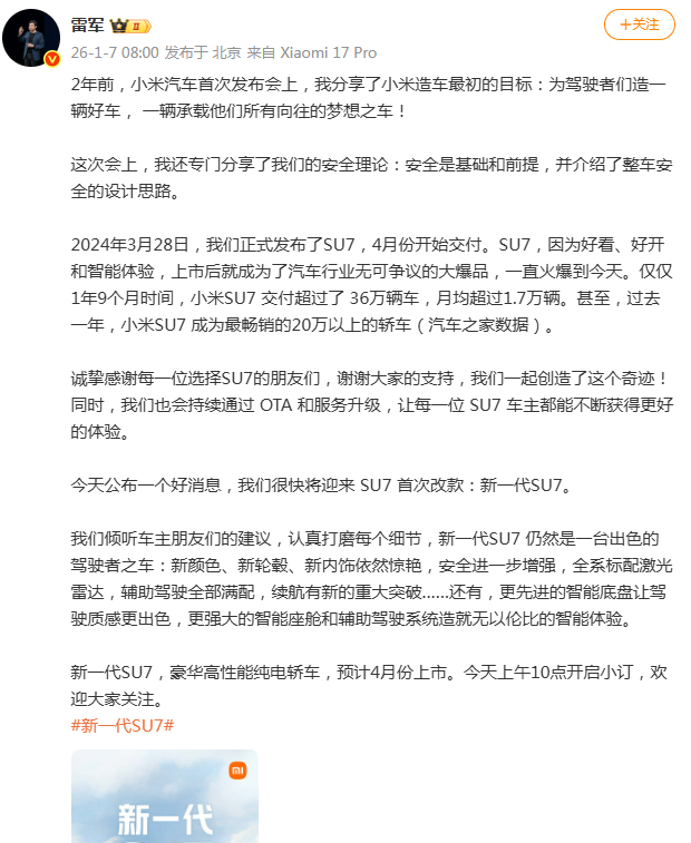 1月7日,雷军发文:今天公布一个好消息,我们很快将迎来 SU7 首次改款:新一代SU7。