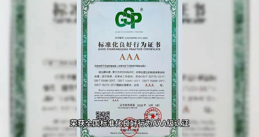 2025年10月,历下城管建立的城管服务标准体系凭借结构合理、运行有效、标准化工作成效显著的突出优势,荣获国家标准化良好行为 AAA 级评价证书。通过标准化方法与理念的持续运用,让全局干部职工标准化意识内化于心、外化于行,真正做到了事事从标准化角度出发,队伍素质素养有效提,城市管理从“经验型”向“标准化”转变。