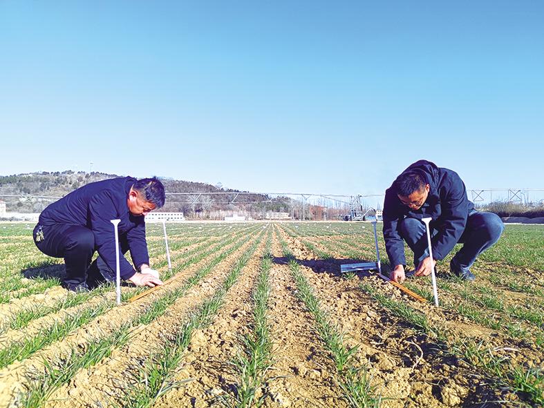 5日上午,市农科院4号试验田里,小麦育种团队正顶着寒风,蹲在地上做田间调查。