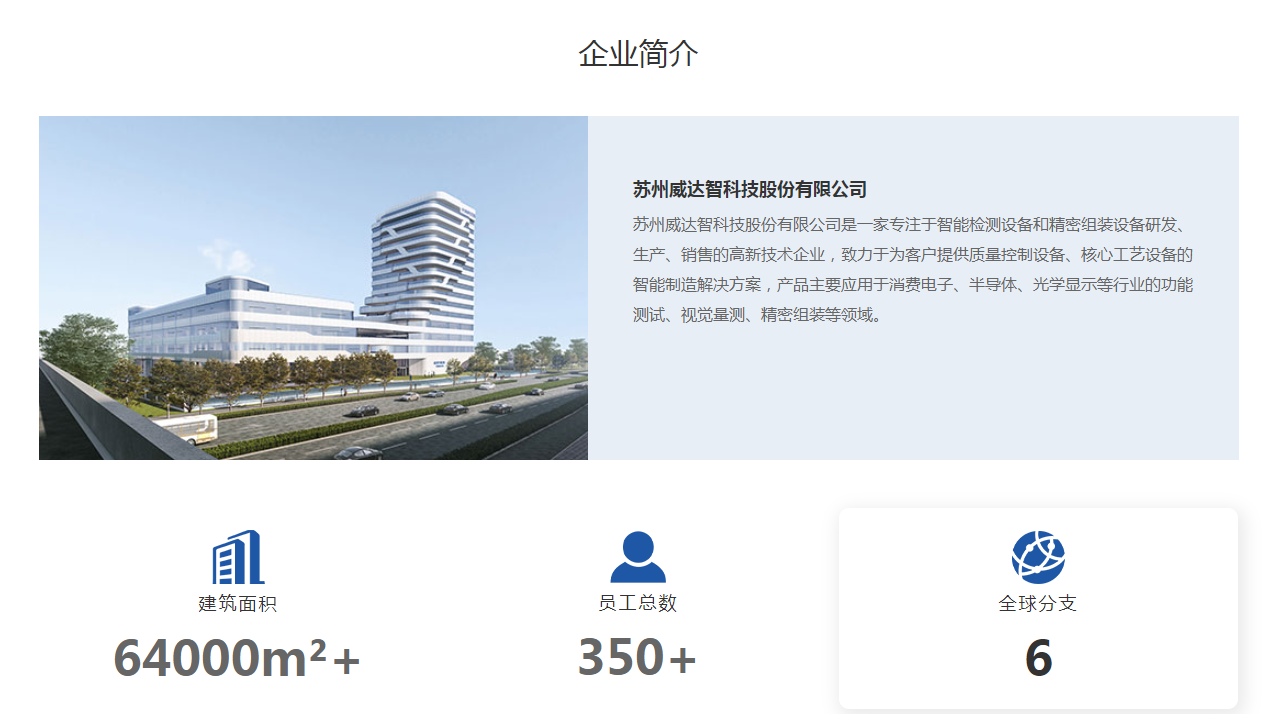 据威达智官网介绍,公司是一家专注于智能检测设备和精密组装设备研发、生产、销售的高新技术企业,致力于为客户提供质量控制设备、核心工艺设备的智能制造解决方案,产品主要应用于消费电子、半导体、光学显示等行业的功能测试、视觉量测、精密组装等领域。