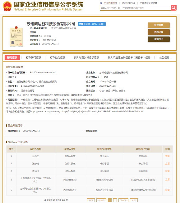国家企业信用信息公示系统显示,苏州威达智科技股份有限公司成立于2016年,法定代表人汪静晴。此外,威达智曾于2023年6月冲击IPO,但在2024年5月21日,深交所披露了关于终止对苏州威达智科技股份有限公司首次公开发行股票并在创业板上市审核的决定。