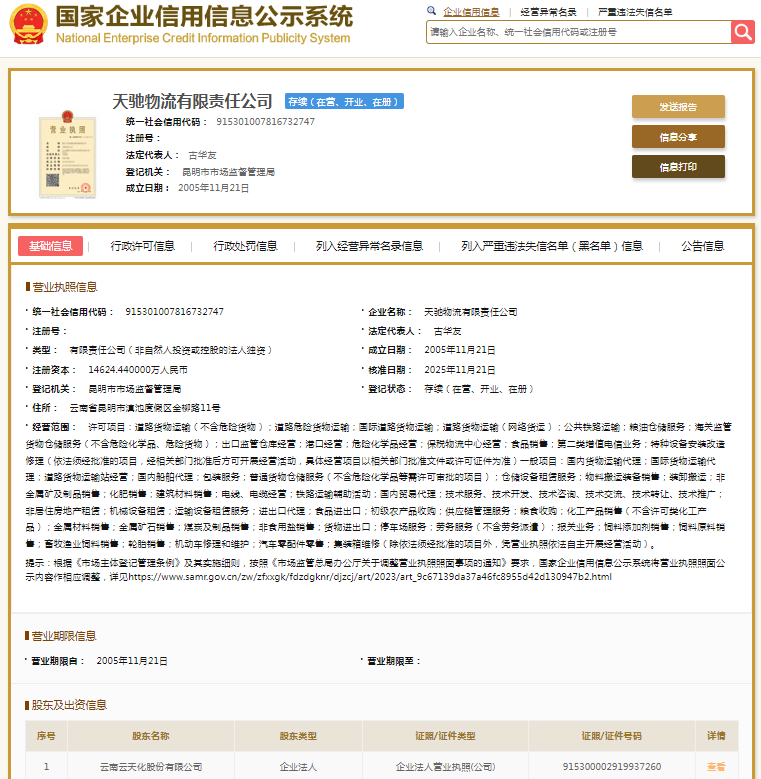 国家企业信用信息公示系统显示,天驰物流有限责任公司成立于2005年,注册资本14624.44万元人民币,法定代表人为古华友,由云天化(600096.SH)全资持股。