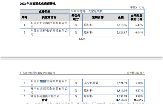 邦泽创科在不同时期的公开文件中,对核心供应商的披露出现显著矛盾。新三板公开转让说明书显示,2022年东莞市酬勤包装制品有限公司以2521.39万元真空包装袋采购金额,位列前五大供应商第三名,占当年采购总额的5.80%。但在最新披露的北交所招股书(上会稿)中,该供应商却从五大名单中消失,仅在重大采购合同中提及,合同内容变为“采购、委外加工、模具使用”。而问询函回复更显示,该公司实为报告期内前十大外协供应商,采购总额1654.27万元,核心采购内容是“厨房电器耗材”。同一供应商的采购金额、业务类别在不同文件中差异巨大,信息披露的准确性与一致性存疑。