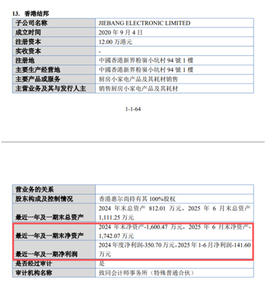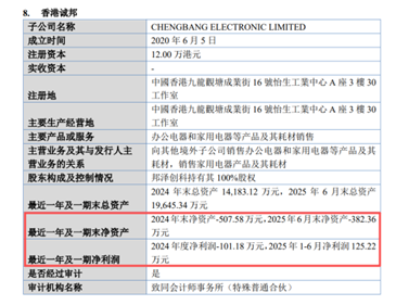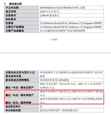 另外,作为公司“全球本地化服务”战略的核心载体,邦泽创科的多家境外子公司持续陷入亏损困境。招股书显示,香港诚邦、新加坡众邦、香港结邦等关键境外子公司均存在净资产为负的情况:香港结邦2025年6月末净资产为-1742.07万元,2024年及2025年上半年分别亏损350.70万元、141.60万元;新加坡众邦同期净资产-387.68万元,连续两个报告期净利润为负;香港诚邦虽在2025年上半年实现125.22万元盈利,但此前一年仍亏损101.18万元,累计净资产仍为负数。