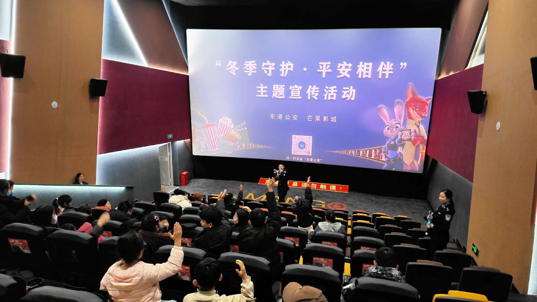 “回答正确!这是您的‘警察兔’,请收好!”昭阳路派出所民警许方正将玩偶递给一位刚刚答对所有安全问题的小学生。12月14日晚,结合热映电影《疯狂动物城2》的放映,在电影开场前后的黄金时段,东港公安走进影厅,在银幕前进行了一场简短而实用的“平安加映”微宣讲。