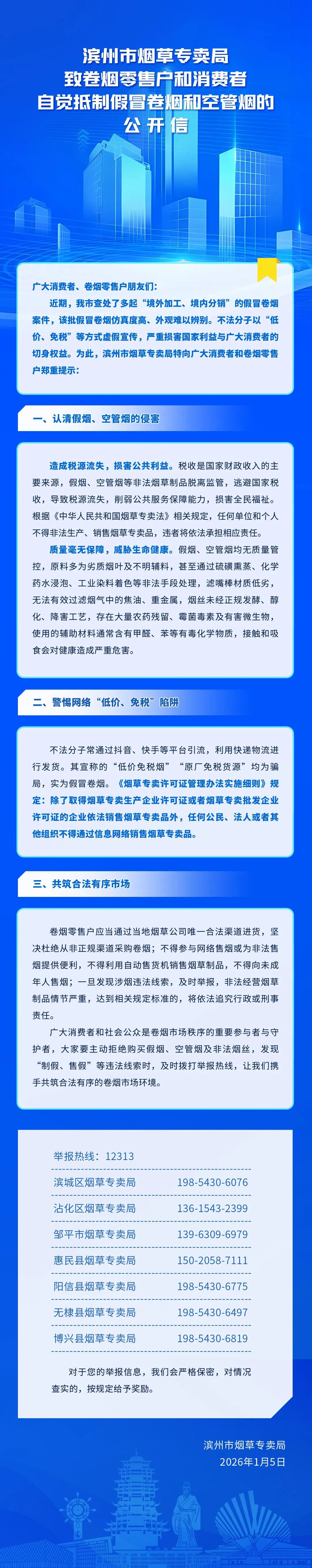 自觉抵制假烟空管烟,滨州市烟草专卖局致零售户和消费者的公开信