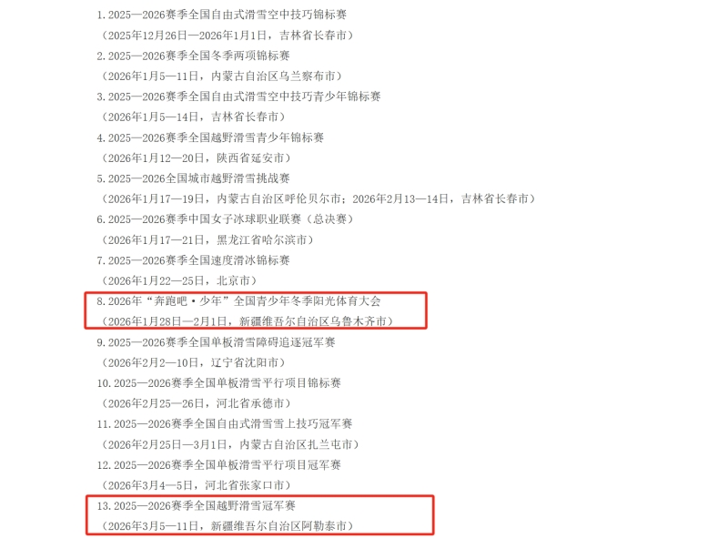 近日,国家体育总局、文化和旅游部发布“跟着赛事去旅行”2025—2026全国冰雪赛事活动目录,其中,我区将承办两项重要赛事:2026年1月28日—2月1日在乌鲁木齐市举办的2026年“奔跑吧·少年”全国青少年冬季阳光体育大会,以及2026年3月5—11日在阿勒泰市举办的2025—2026赛季全国越野滑雪冠军赛。