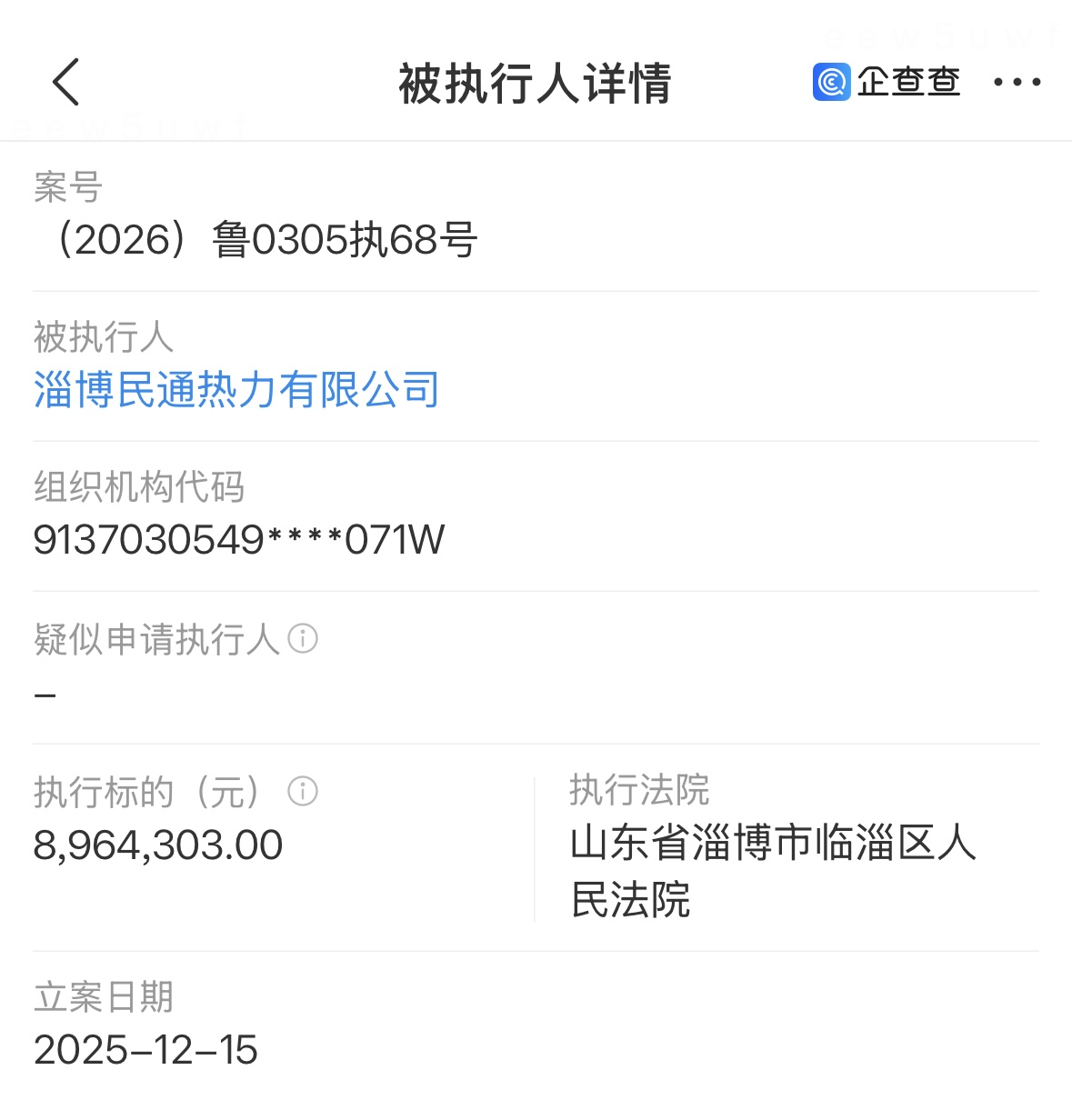 企查查信息显示,2025年12月15日,淄博市临淄区人民法院将淄博民通热力有限公司列为被执行人,执行标的896.43万元。
