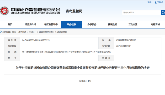 恒泰期货青岛营业部领青岛证监局〔2026〕1号行政监管措施,被责令改正并暂停期货经纪业务新开户三个月